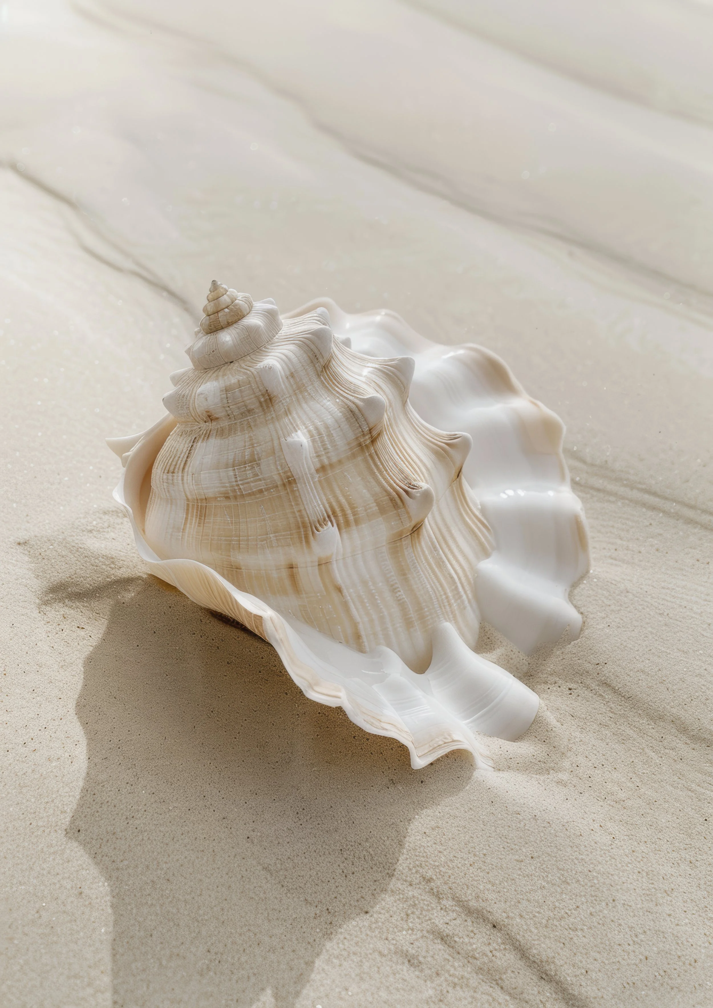A large seashell with a spiral shape, sitting on sandy beach with sunlight creating a shadow.